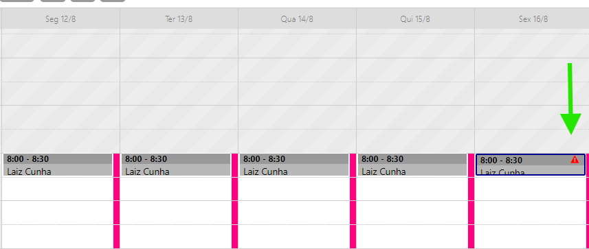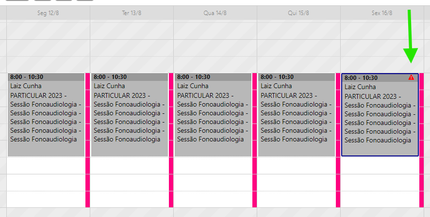Na agenda, será possível visualizar a marcação das 5 sessões conforme definido no agendamento, com o último agendamento destacado com um alerta, conforme ilustrado na imagem.
