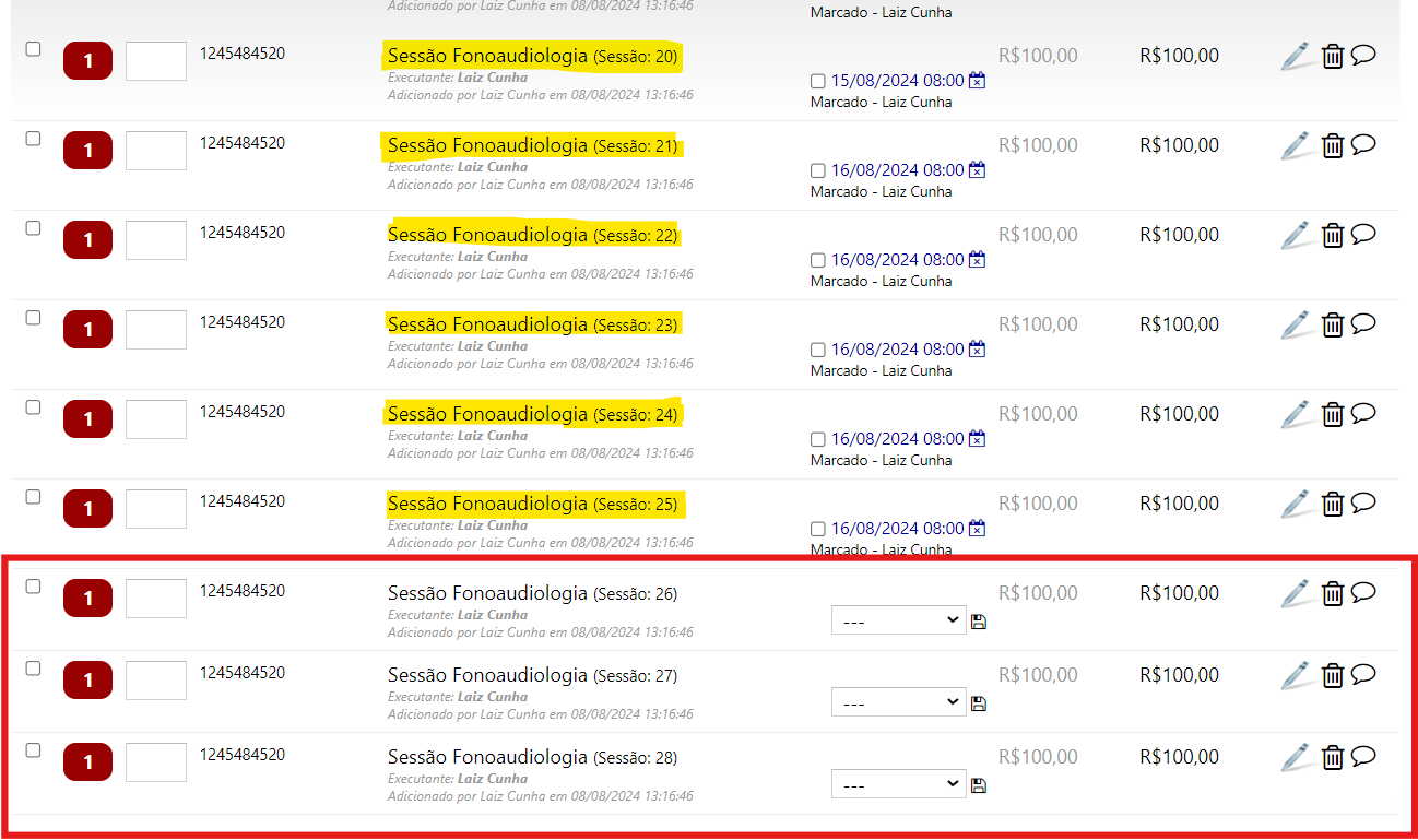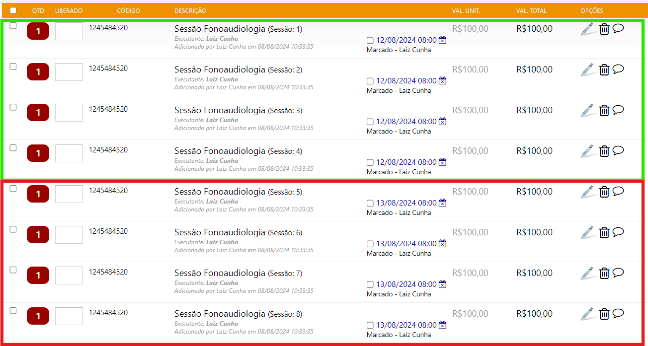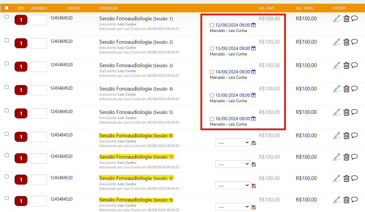 ➡️ Como o número de sessões definida por procedimento é divisível pelo número de sessões agendadas por dia, todos os procedimentos estão vinculados a um agendamento.