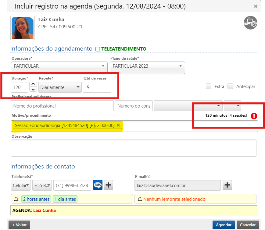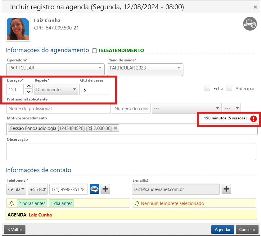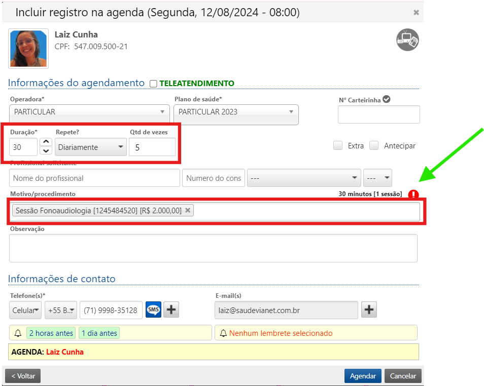 ➡️ No caso de um procedimento de 20 sessões de fono, cada uma com 30 minutos, ao selecionar a repetição diária, o sistema vinculará uma sessão a cada agendamento.