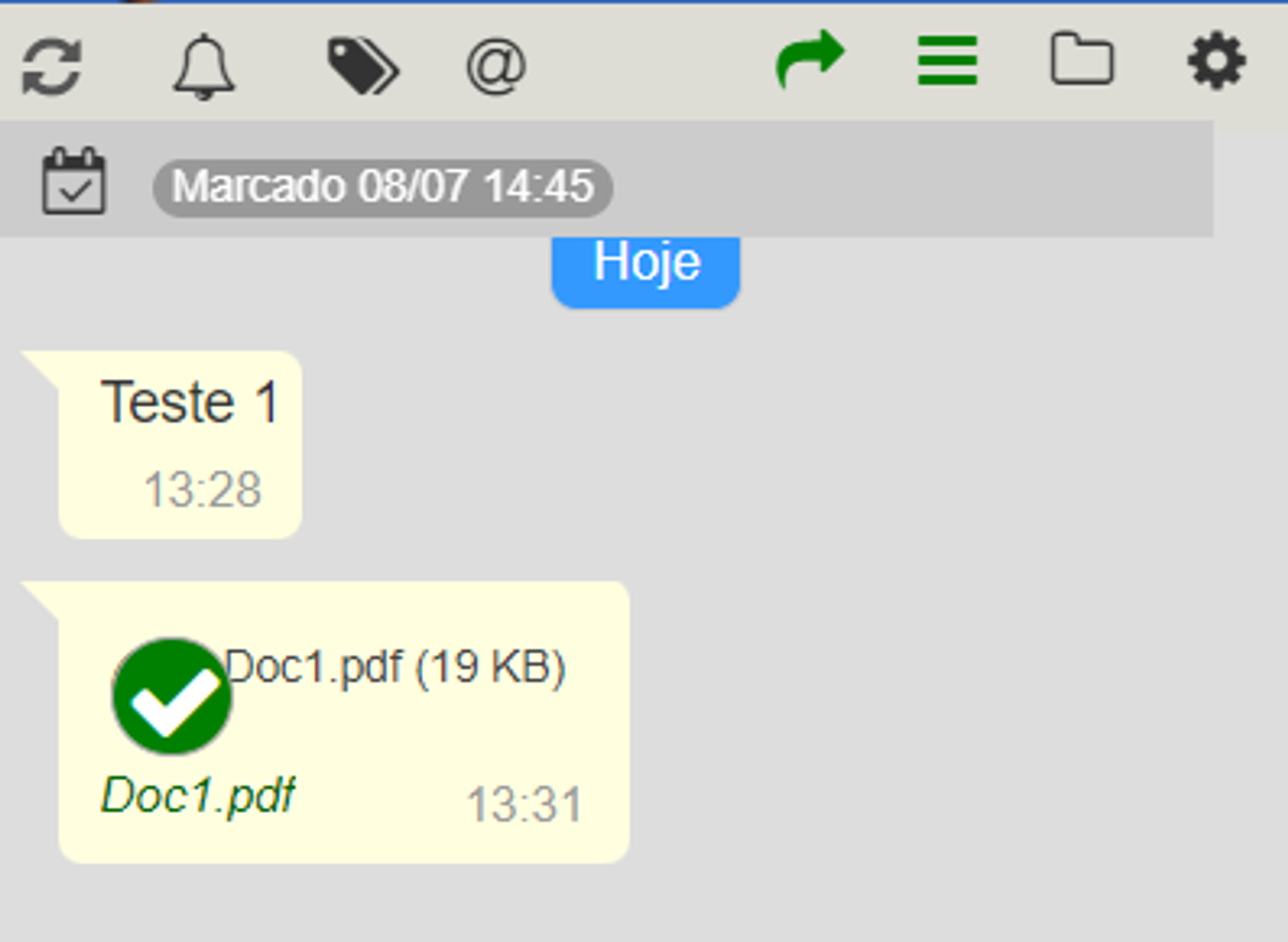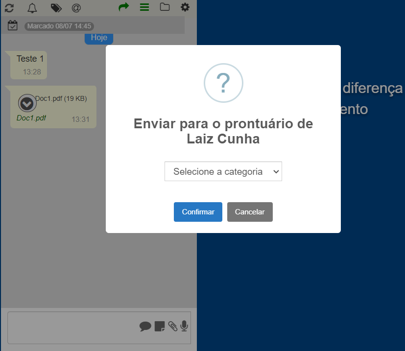 Ao selecionar a categoria e apertar no botão confirmar, o documento é salvo no prontuário e o marcador de seleção no chat muda para a cor verde.
