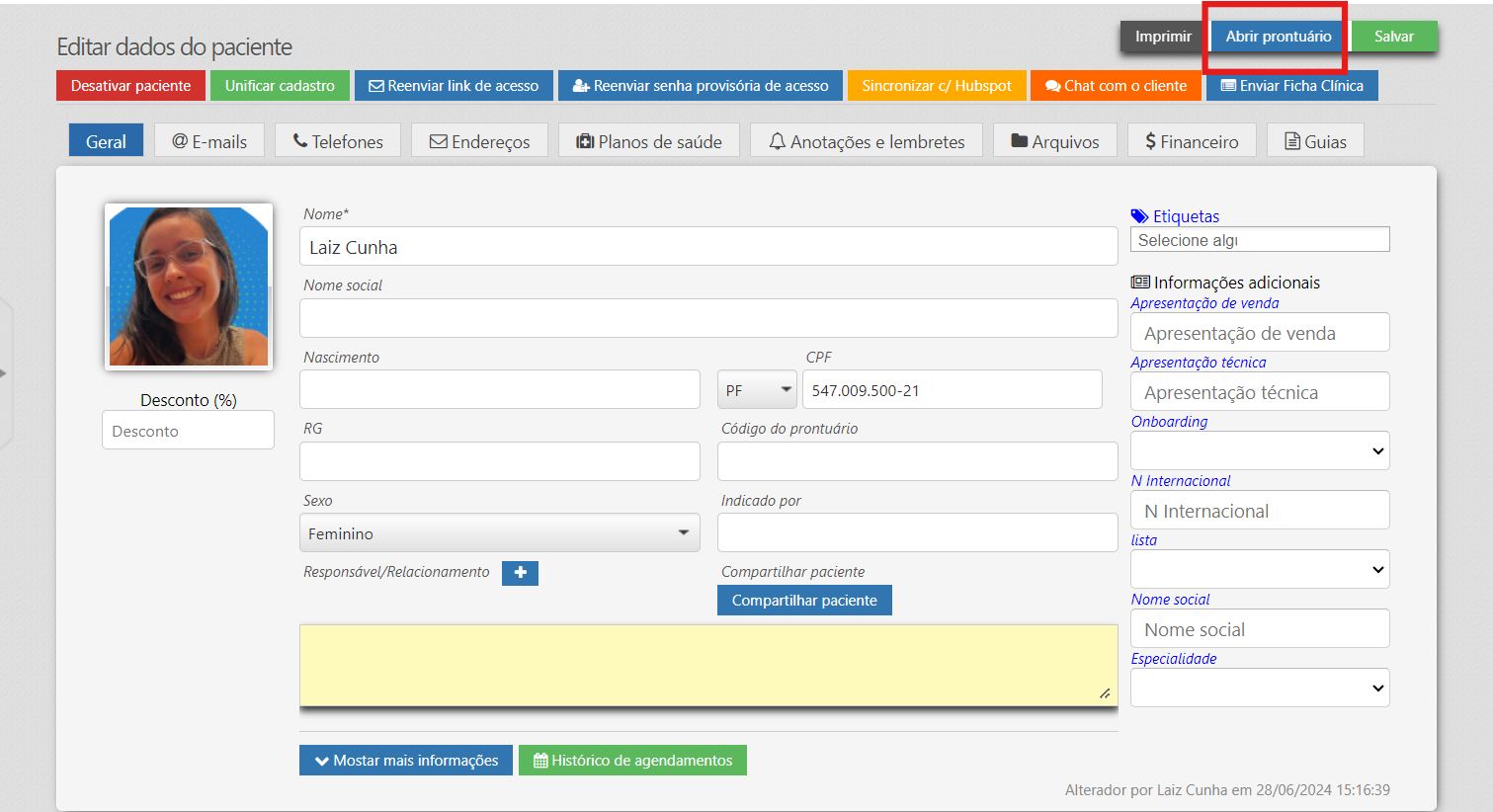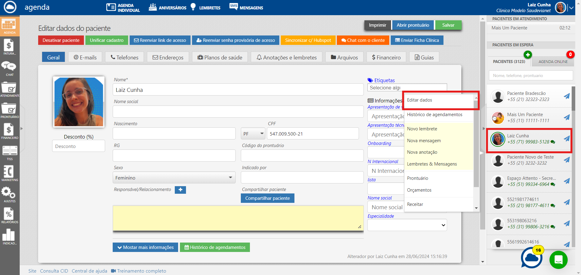 Para acessar os documentos de um paciente salvo pelo chat, é preciso clicar no paciente e ir em ‘editar dados’. A depender da categoria do documento, ele pode ser visível a todos da clinica ou possuir restrições de acesso.