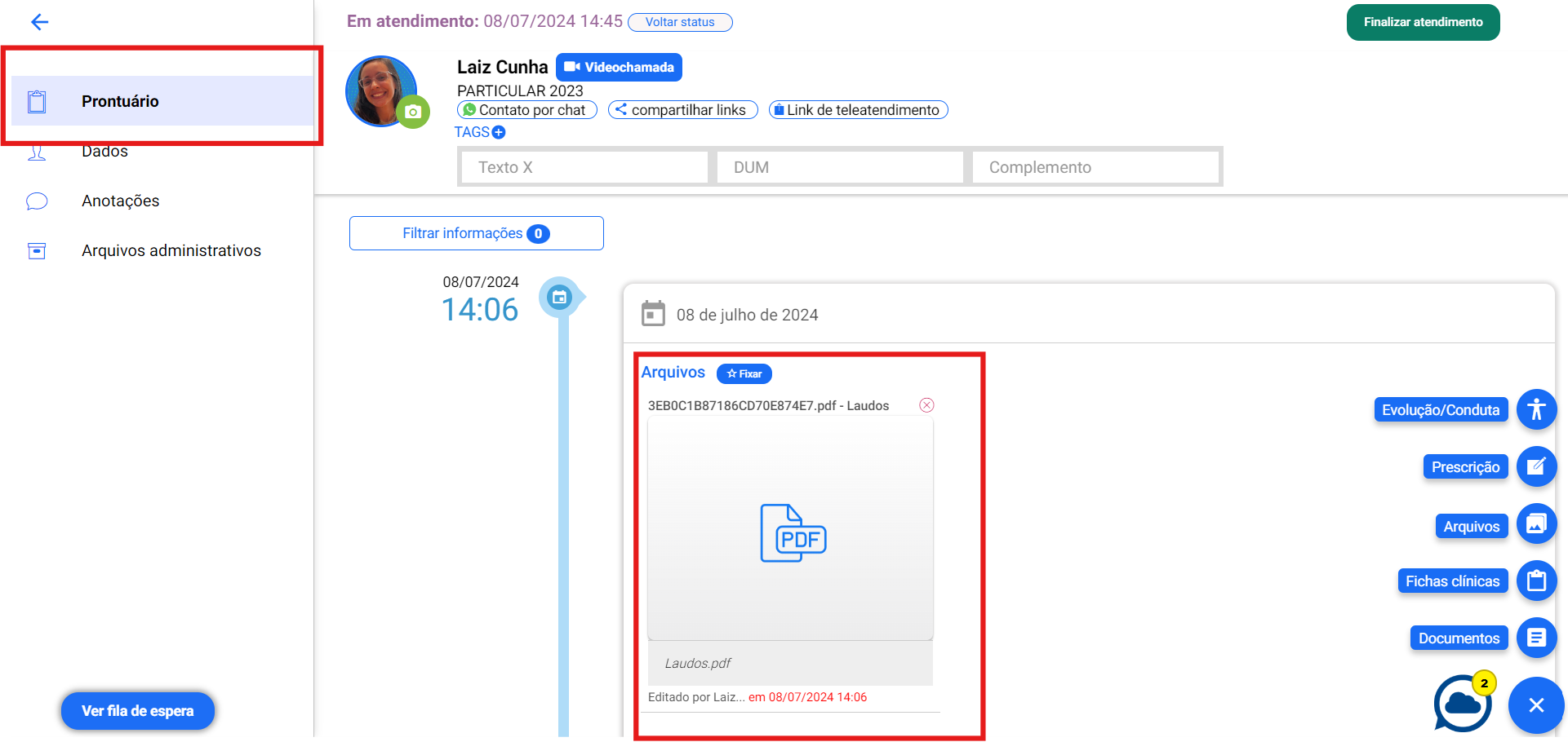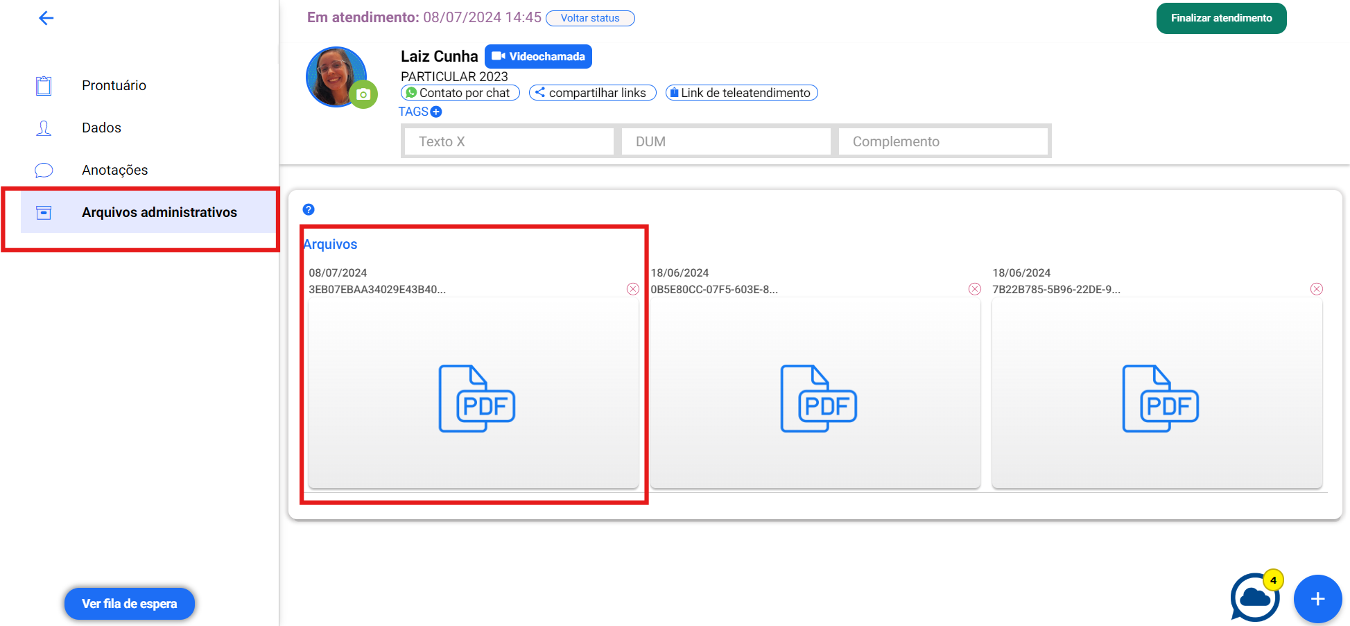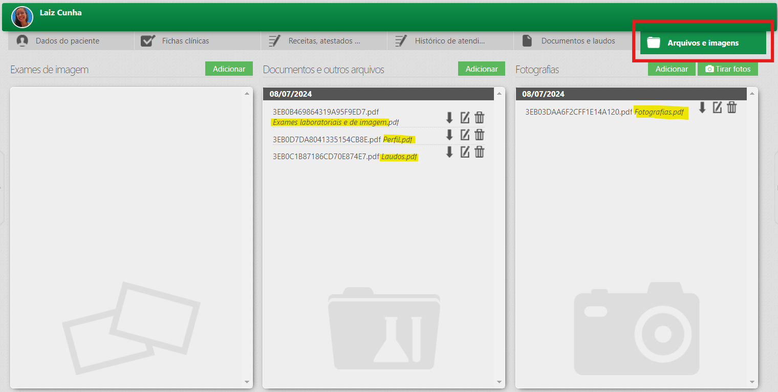 Se for um perfil que possui acesso ao prontuário, os documentos encaminhados podem ser vistos na aba de arquivos e imagens.