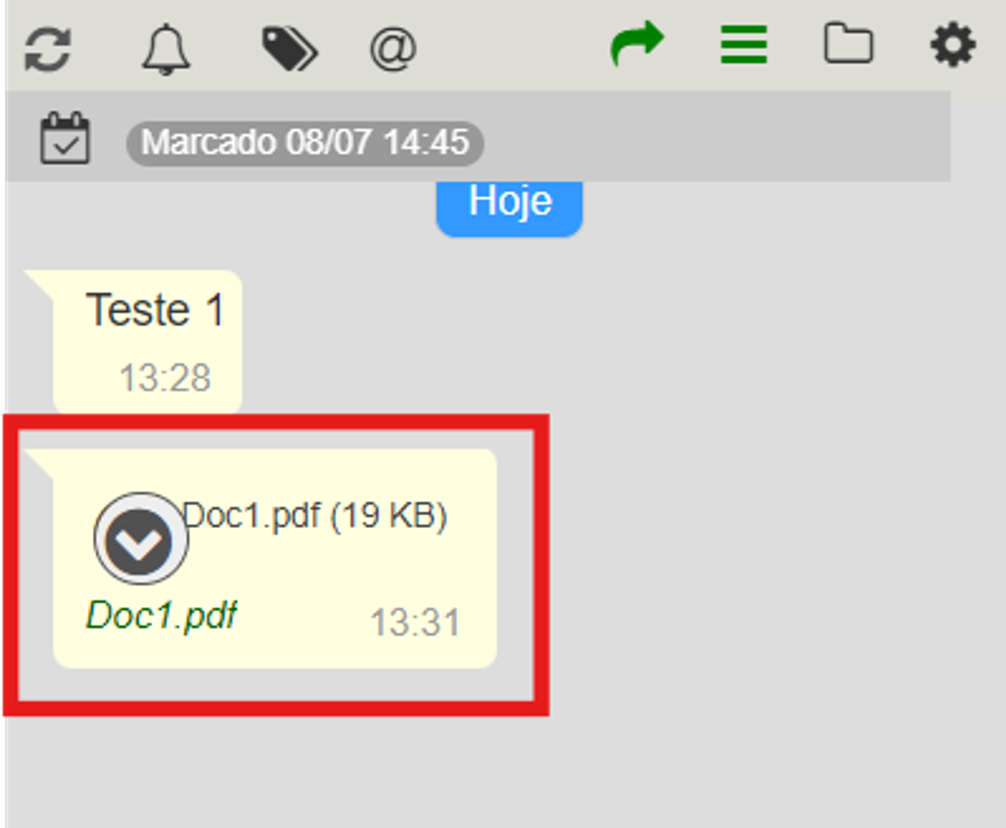 Quando o paciente envia um arquivo em formato PDF pelo chat, o arquivo aparece como mostrado na figura abaixo, com o marcador de seleção em cinza. A equipe responsável na clínica clica no arquivo para salvá-lo.