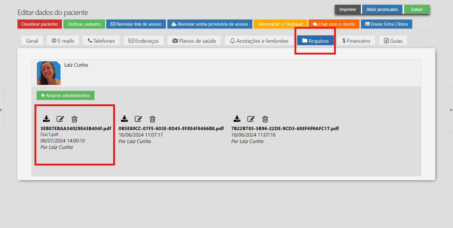 Observação: Quando um arquivo não está visível, é necessário verificar se o chat do paciente foi integrado com o sistema e se há controle de acesso ou perfis que restrinjam a visualização.