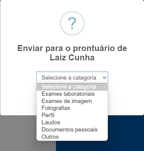 Após clicar em 'Salvar', uma caixa de diálogo aparece para selecionar a categoria no prontuário onde o documento será armazenado. Após a escolha e o salvamento, o documento enviado pelo paciente será arquivado no sistema.