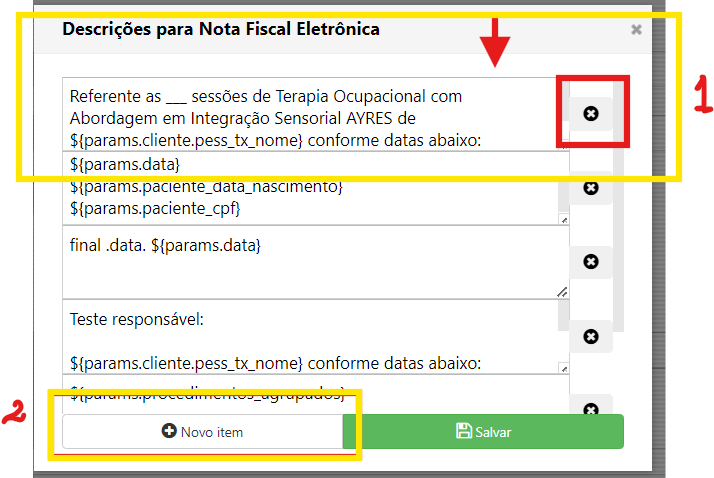 Nesta tela, é possível configurar a descrição do serviço utilizando diversos parâmetros pré-definidos. Você pode editar ou excluir configurações já salvas ( 1 ), além de criar novas configurações conforme necessário ( 2 ).