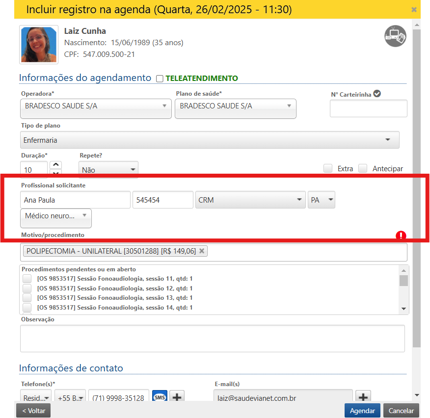 Passo 3: Se o profissional que pediu o atendimento já estiver cadastrado no sistema, dá para escolher ele direto, sem precisar digitar tudo de novo.