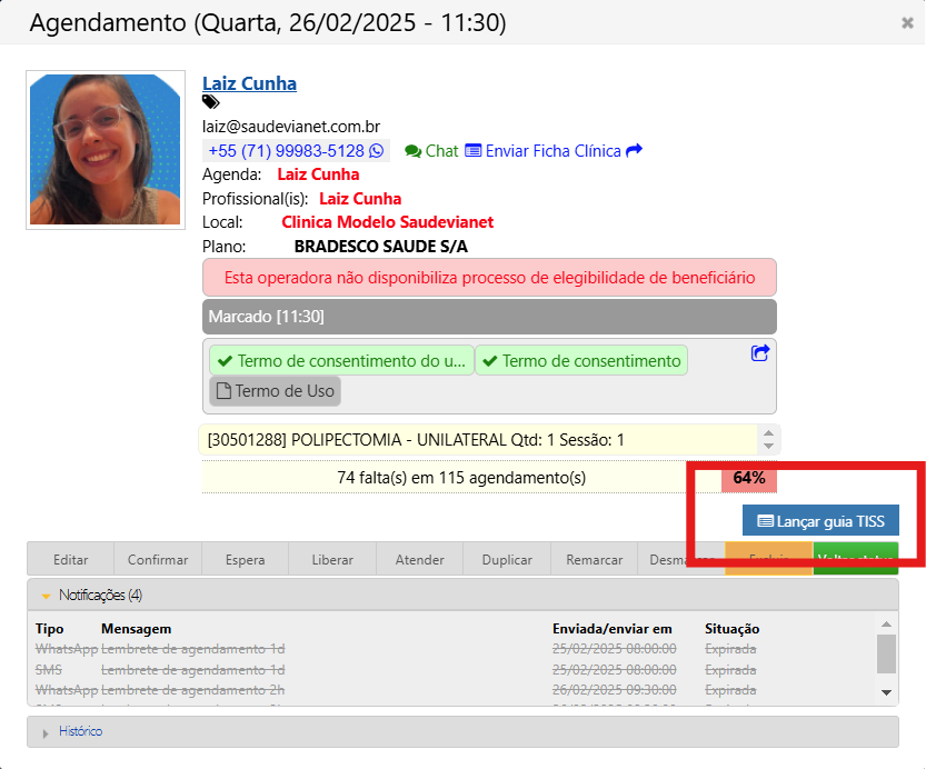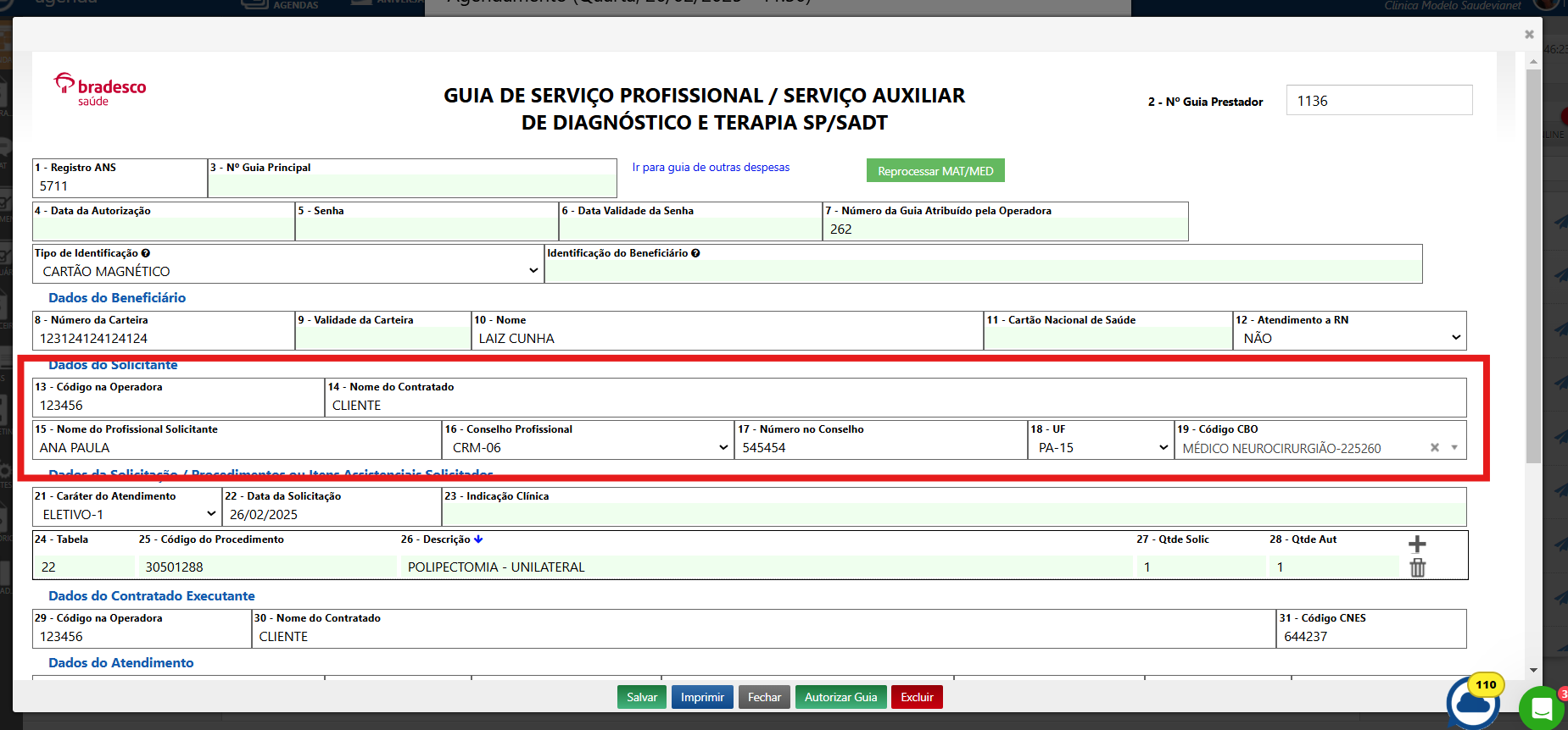 Às vezes, a guia é feita sozinha, sem estar ligada a nenhum procedimento específico. Nesses casos, o sistema não preenche nada automaticamente. Como não tem um procedimento para “puxar” as informações, o nome do profissional que pediu a guia não aparece automaticamente e precisa ser preenchido manualmente.
