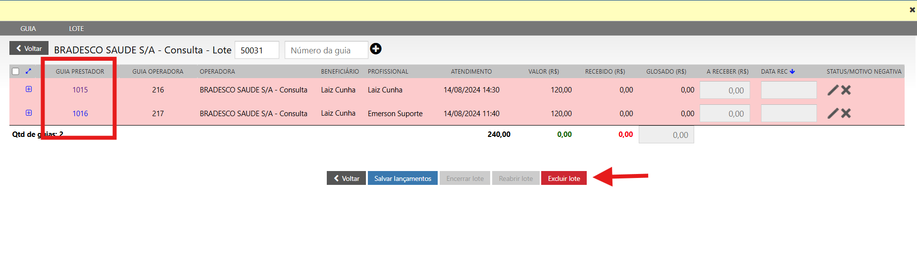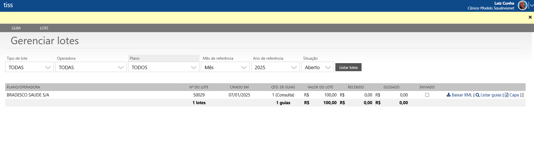 O lote excluído será removido da lista em Gerenciar Lotes, e as guias associadas ficarão disponíveis para vinculação a um novo lote.