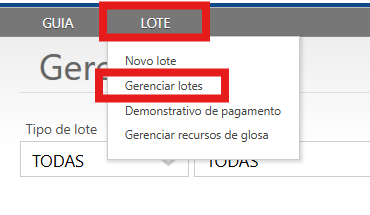 2 - Clique em LOTE e, em seguida, em Gerenciar Lotes. O sistema exibirá a lista de todos os lotes criados, de acordo com os filtros aplicados.