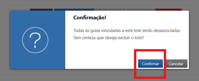 4 - Clique em Excluir Lote. O sistema exibirá uma mensagem de confirmação informando que todas as guias serão desassociadas do lote. Após a exclusão, as guias retornarão à lista, ficando disponíveis para serem atribuídas a um novo lote.