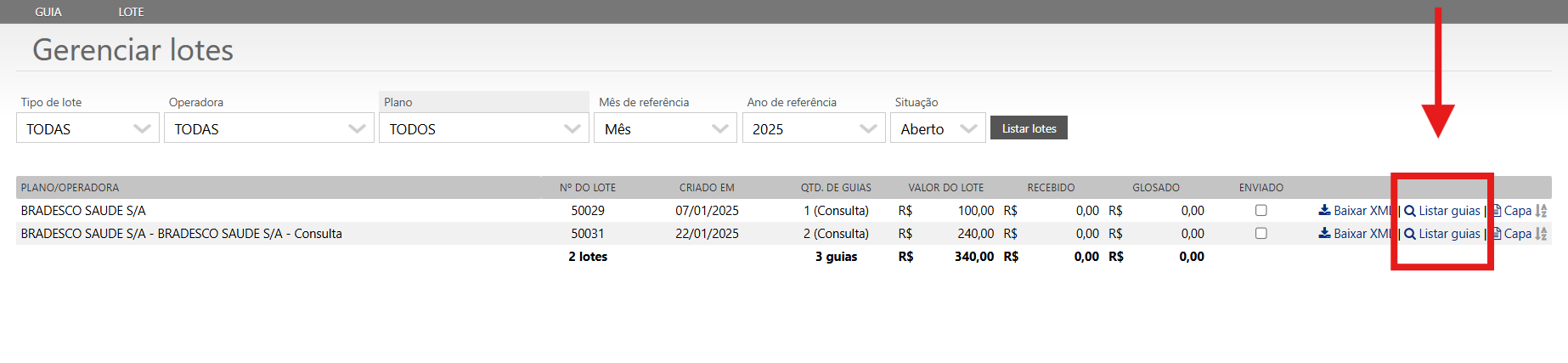 3 - Localize o lote que deseja excluir e clique em Listar Guias do Lote. O sistema abrirá o lote, permitindo visualizar as guias associadas a ele.