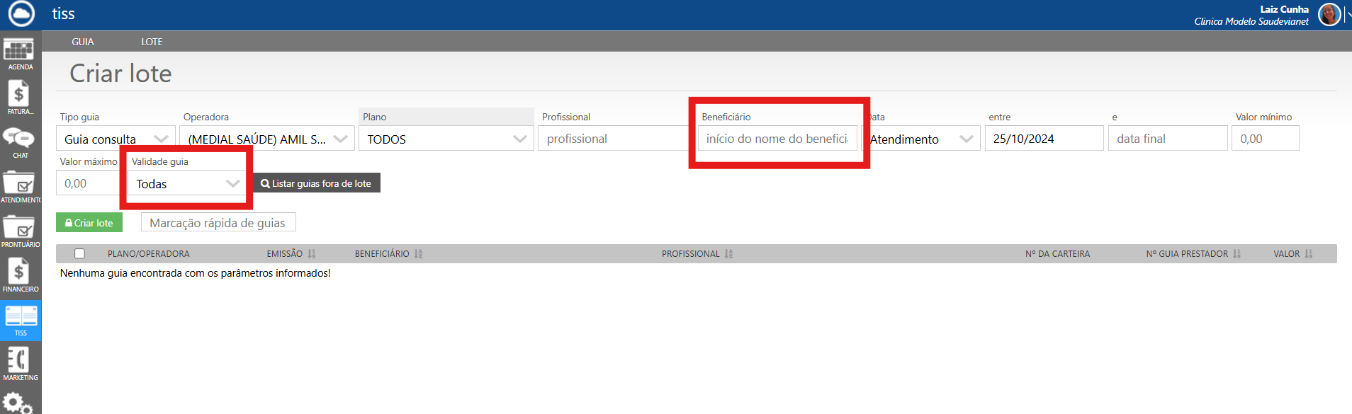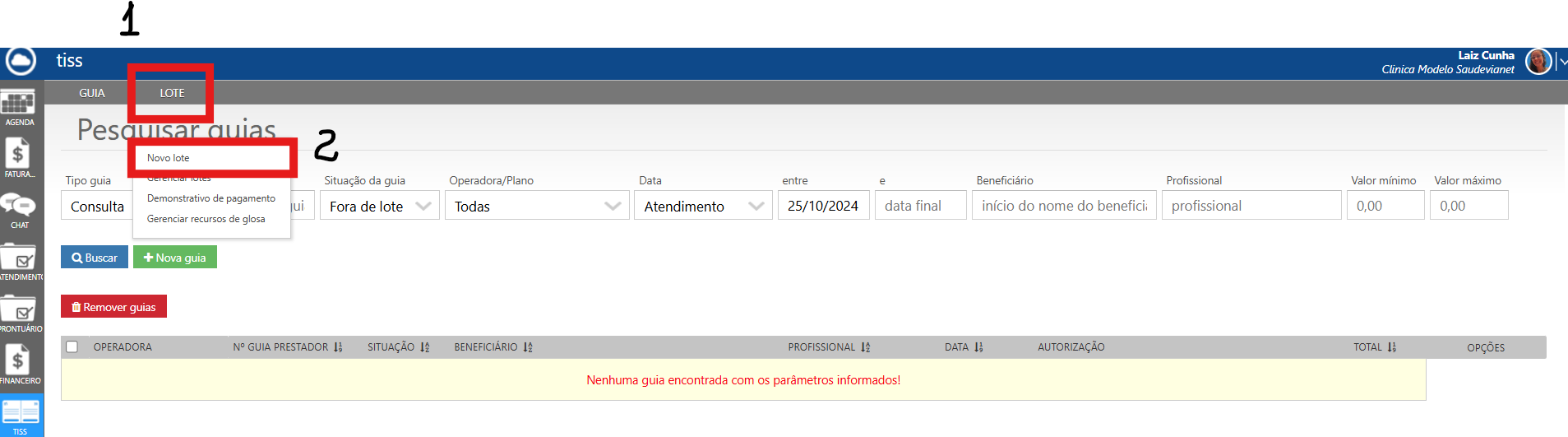 Passo a Passo: Acessando o Módulo de TISS e Criando um Novo Lote com Novos Campos de Busca: