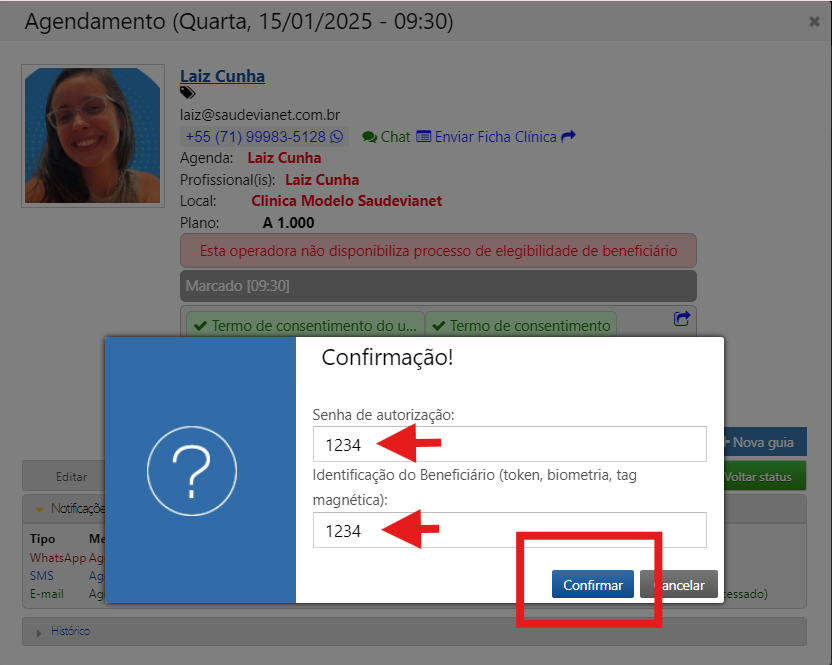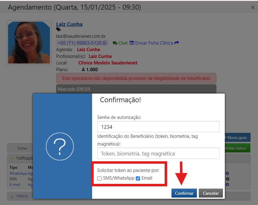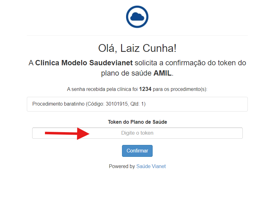 Solicite que o token seja enviado ao paciente pelo canal configurado (E-mail, SMS ou WhatsApp). A senha de autorização é a senha criada pela instituição.