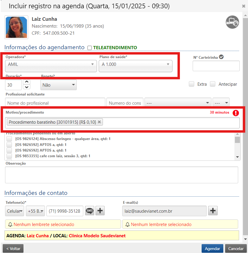 Realize o agendamento de um procedimento associado ao plano AMIL para o paciente.