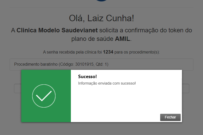 Esta funcionalidade foi desenvolvida para atender à necessidade da instituição Cedro Saúde, em parceria com a operadora AMIL. Seu objetivo é permitir o envio de um link ao paciente para o preenchimento do token necessário à autorização de atendimento.