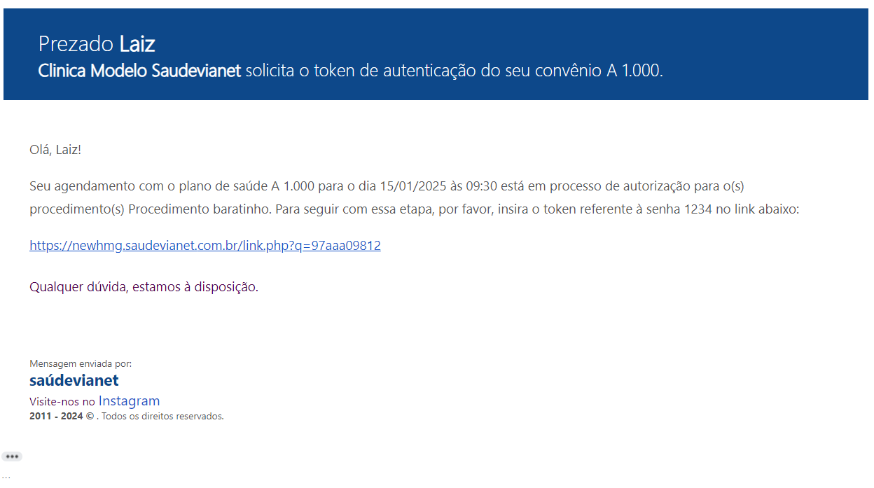 O paciente receberá o token pelo canal escolhido pela secretária no momento do agendamento. Neste exemplo, demonstraremos o envio por e-mail. O paciente deve acessar o link recebido e preencher o token enviado pela operadora por mensagem. Vale lembrar que, a cada solicitação de autorização de procedimento, a operadora gera e envia um novo token ao paciente.