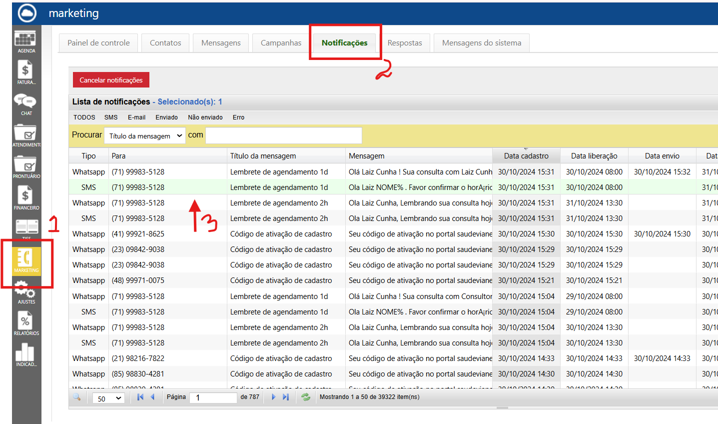 Para verificar os lembretes enviados, acesse a aba Marketing, clique em Notificações e abra as mensagens do agendamento realizado.