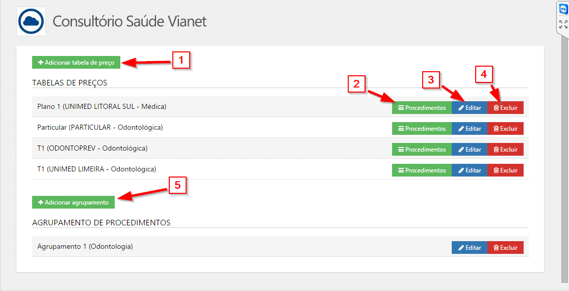 Na tela que aparece, você pode Adicionar uma nova tabela de preços (1), adicionar procedimentos a uma tabela de preços pré-existente (2), editar as configurações de uma tabela pré-existente (3) ou excluir uma tabela (4).
