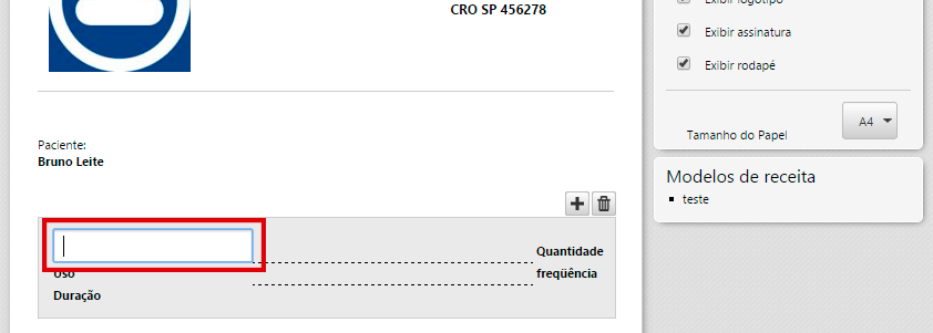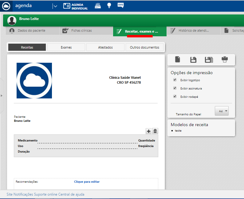 Na opção "Receitar, exames...", você pode prescrever receitas médicas, exames, entre outros documentos.