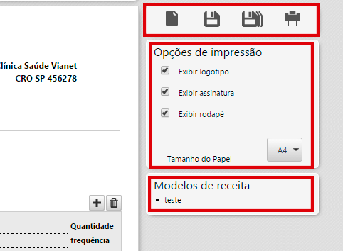 Abaixo, em MODELOS DE RECEITA, você tem uma lista com os modelos de documento salvos anteriormente, e escolhe se deseja utilizar ou excluir algum deles.