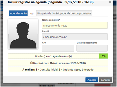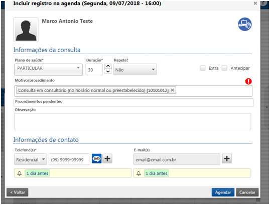 2- Você inclui o registro do paciente com todos os seus dados, informando o seu plano/particular, o tempo de duração, repetição, o motivo/procedimento, observação e suas informações de contato.