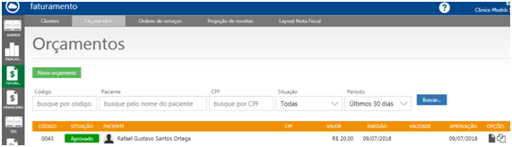 O orçamento é usado em algumas especialidades, e quando a clínica realiza exames e procedimentos que são solitados pelos médicos da casa. Um orçamento é grado automaticamente a partir de uma solicitação médica, assim, a equipe administrativa pode abordar o paciente. Acompanhamento da situação do paciente. Um orçamento aprovado gera uma fatura (ordem de serviço)