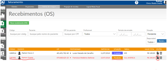 Em sua agenda eletrônica Saúde Vianet você terá a opção faturamento, podendo cadastrar novos pacientes, emitir o valor de cada procedimento e verificar se tem algo pendente como atraso, pagamento com vencimento próximo ou pagamento aprovado.