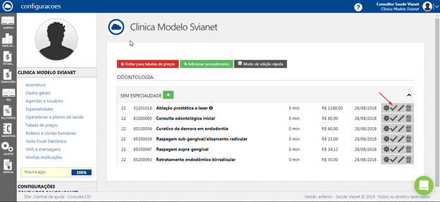 - Após ir para tabelas de preço, e clique em procedimentos da tabela desejada.