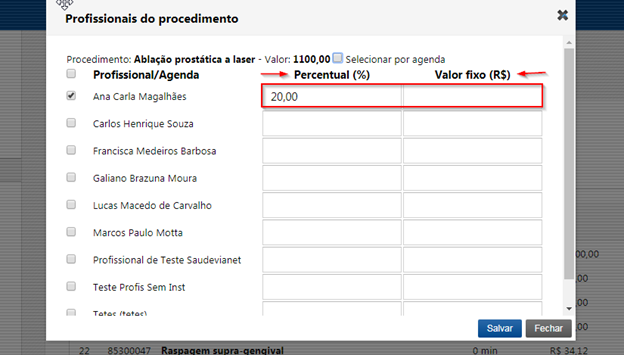 Após selecionar o profissional para este procedimento, escolha se o profissional receberá porcentual ou valor fixo.