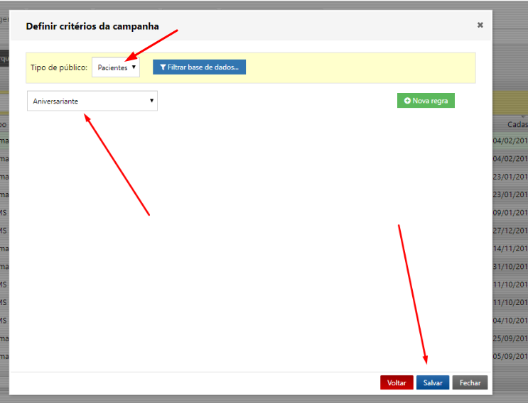 5. Escolha a opção Pacientes e, em seguida, selecione a regra Aniversariante. Salve a campanha: