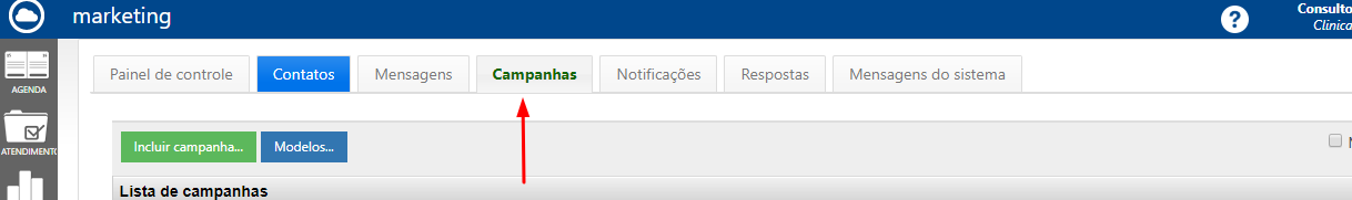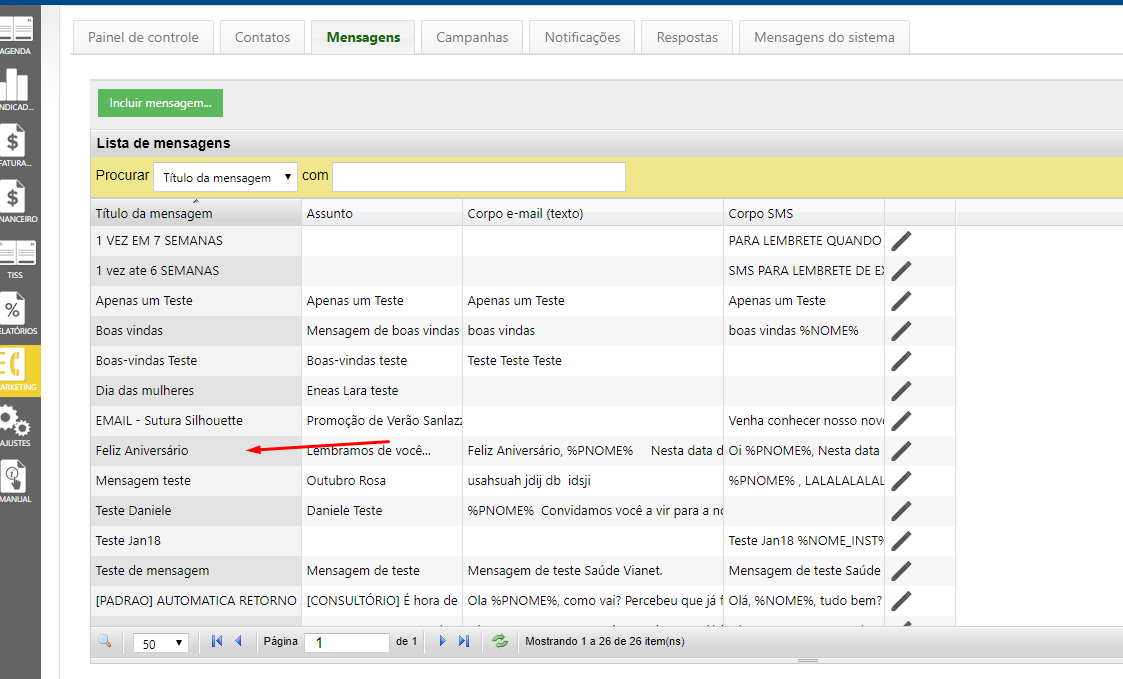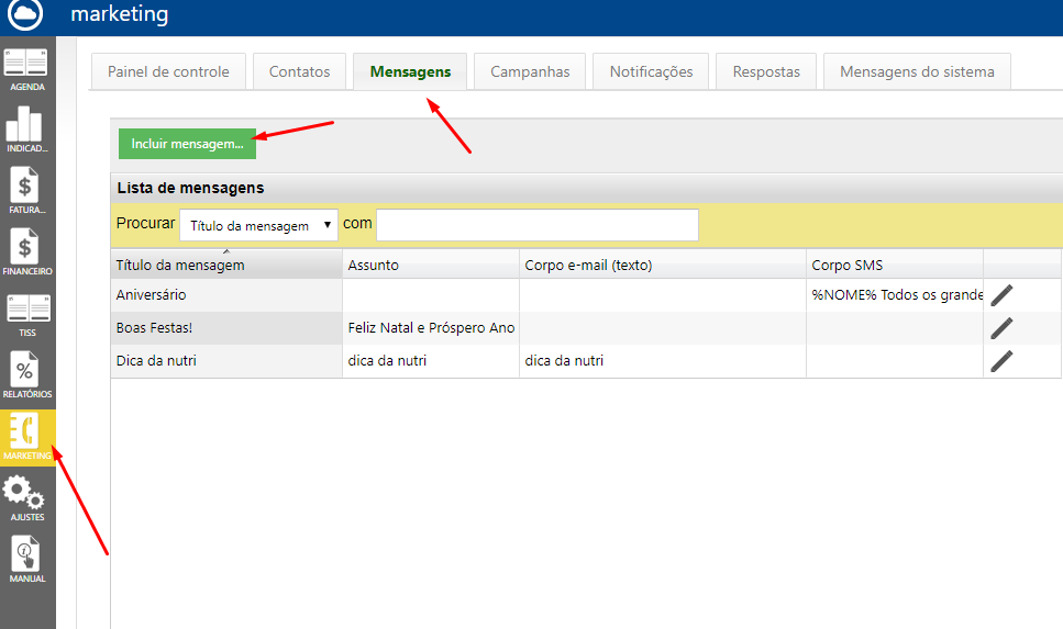 Selecione o menu Marketing na barra lateral esquerda/ Navegue até a aba Mensagens/ Clique no botão Incluir Mensagens.