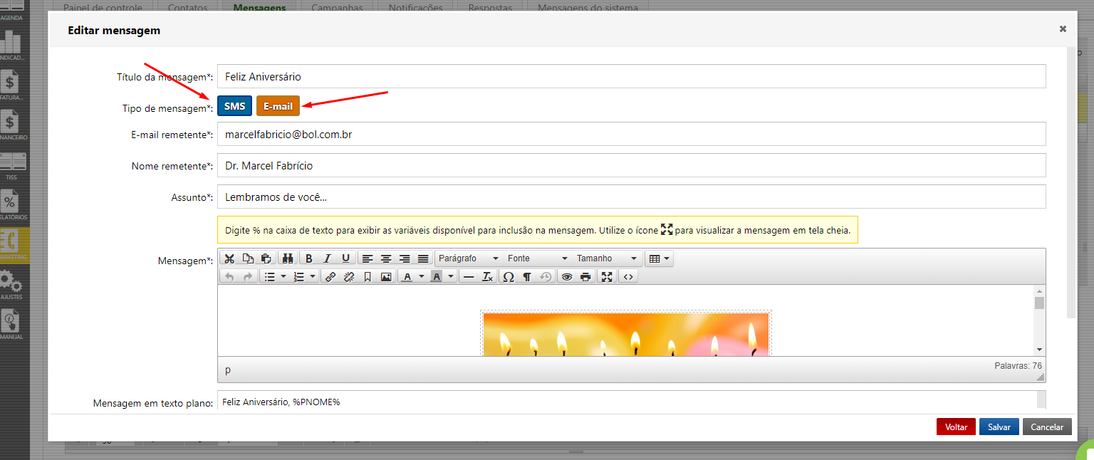 2. Nomeie e redija a sua mensagem. Se quiser que também seja enviado um e-mail de aniversário, selecione a opção e-mail juntamente com a opção SMS: