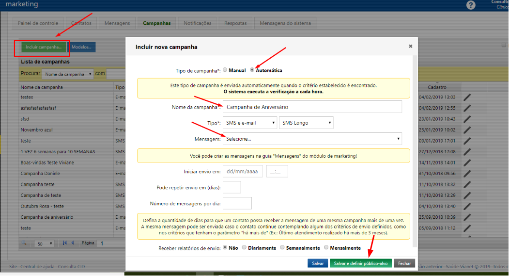 4. Agora, navegue até a aba Campanhas/ selecione incluir campanha/ assinale na opção tipo de campanha automática/ nomeie sua campanha/ escolher a mensagem que você redigiu na aba anterior. Clique em Salvar e definir público-alvo para continuar: