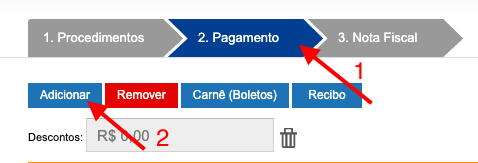 Na de Ordem de Serviço do paciente, escolha opção "pagamento" e em seguida "adicionar": teste