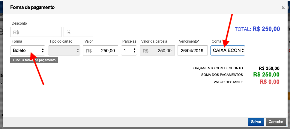 Feito isso, edite as informações e confira se a forma de pagamento selecionado é a boleto e a conta configurada e habilitada para recebimento de boleto: É importante que verifique se ao escolher a opção boleto, foi alterado a conta bancária de acordo a imagem abaixo.