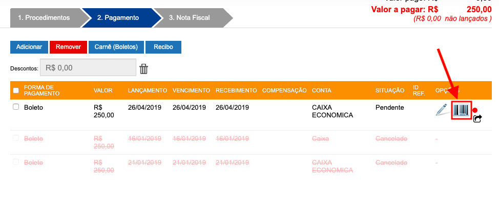 Agora é só clicar no ícone do código de barras e em seguida solicitar para imprimir o boleto: