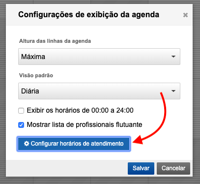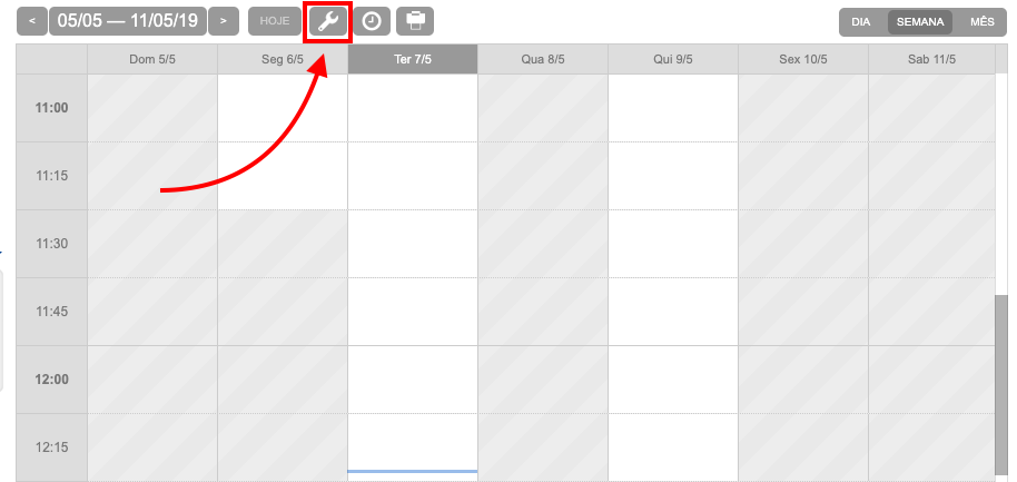 Para isso, vá no módulo Agenda e clique no ícone de configuração: