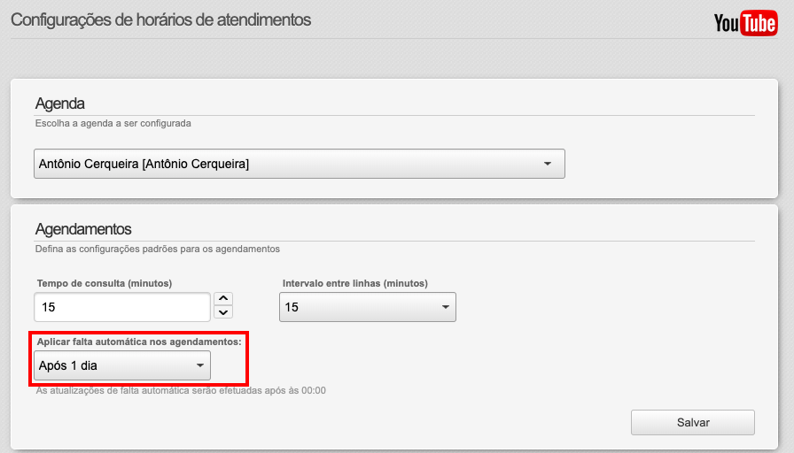 O sistema permite que a data para aplicação da falta seja configurada, ou seja, você pode escolher a partir de quanto tempo após o agendamento faltado aquele paciente receberá a falta.