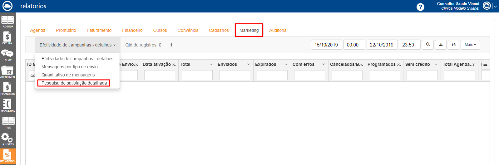 Para gerar o relatório de pesquisa de satisfação é simples, primeiro passo é acessar o modulo de relatórios, apos selecionar a opção de marketing, tem que especificar qual é o relatório, selecionando o tipo, pesquisa de satisfação detalhada.
