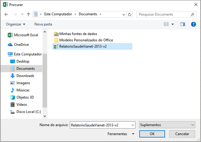 4. O Excel irá exibir a lista de Suplementos existentes, clique no botão Procurar e localize o arquivo do relatório que você fez o download, sem seguida clique em OK. Veja nas imagens abaixo: