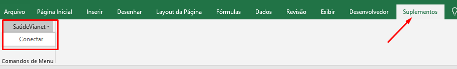6. Para acessar o Sistema vá a guia Suplementos, e clique em Conectar. Preencha com seus dados de usuário e clique em Login. Veja na imagem abaixo: