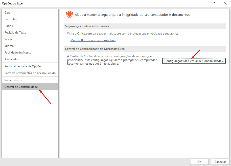 5. Clique no Menu Arquivo (Botão Office), em seguida no menu Opções do Excel, depois em Central de Confiabilidade, clique no botão Configurações da Central de Confiabilidade, em seguida Locais Confiáveis e Adicionar Novo Local, localize a pasta onde se encontra o arquivo do relatório que você fez o download, selecione e clique em OK em todas as telas.