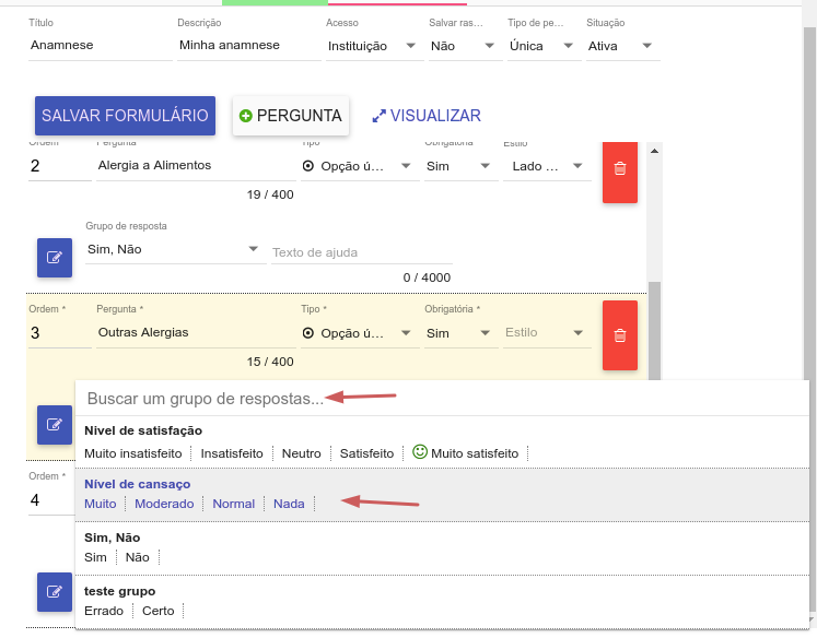 Essas opções possibilitam a seleção de apenas uma ou várias respostas, respectivamente, e por isso possuem um grupo de reposta. Esse grupo de resposta pode ser adicionado por você, ou selecionando dentre os já existentes.