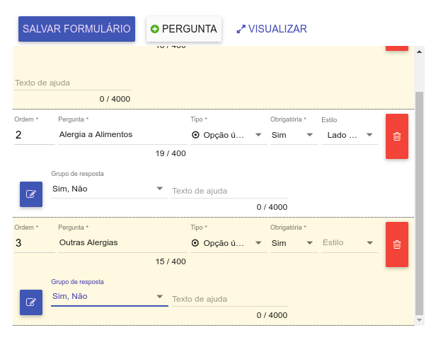 3 - Após clicar em "+ PERGUNTA" será exibido um formulário para preenchimento com as perguntas que devem constar nessa ficha;