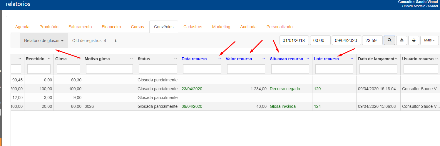 Recurso de glosas é uma recurso disponivel no modulo relatórios para utilização de controle das glosas emitidas como recurso para novo processamento do convenio.