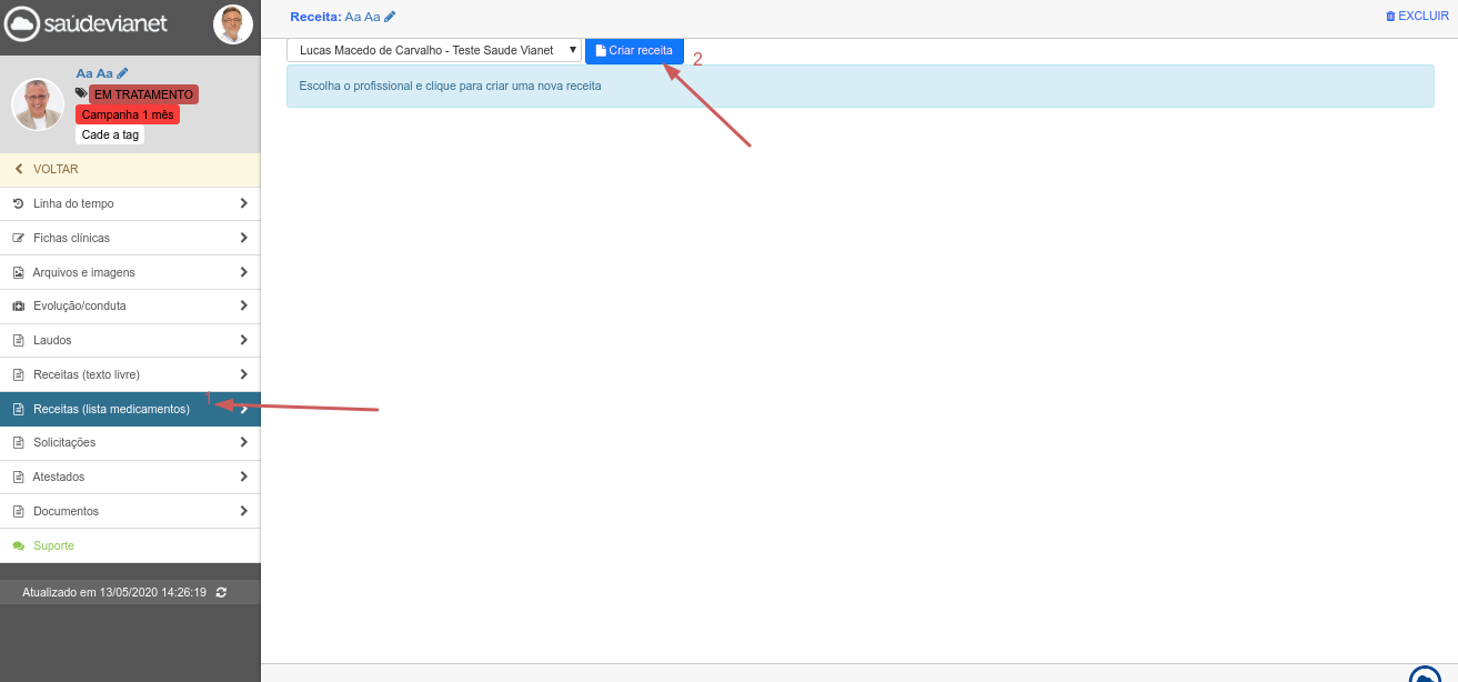 Passo 1 - Primeiro é preciso selecionar, em atendimento, a "Receita (lista medicamentos)" 1), após selecionar um paciente. Em seguida, clicar em criar receita 2).