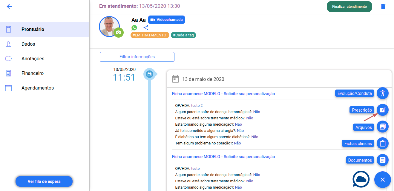 Passo 4 - Quando as receitas forem assinadas digitalmente, o documento será destacado conforme abaixo na linha do tempo do paciente.