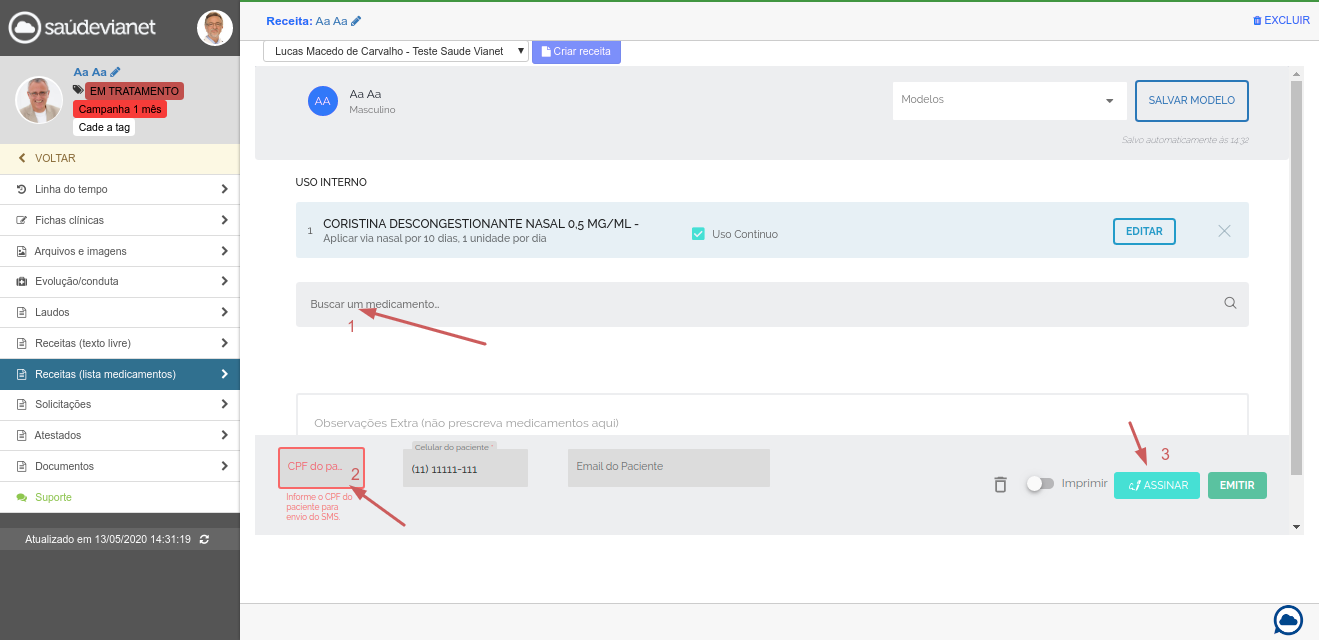 Passo 2 - Após o passo anterior, uma possibilidade de criação de receita será apresentada. É preciso adicionar as medicações necessárias para o paciente 1), como na imagem a abaixo. É preciso adicionar a informação do cpf do paciente 2), caso ele já não tenha essa informação adicionada nas informações. Por fim, 3), selecionar assinar a receita.