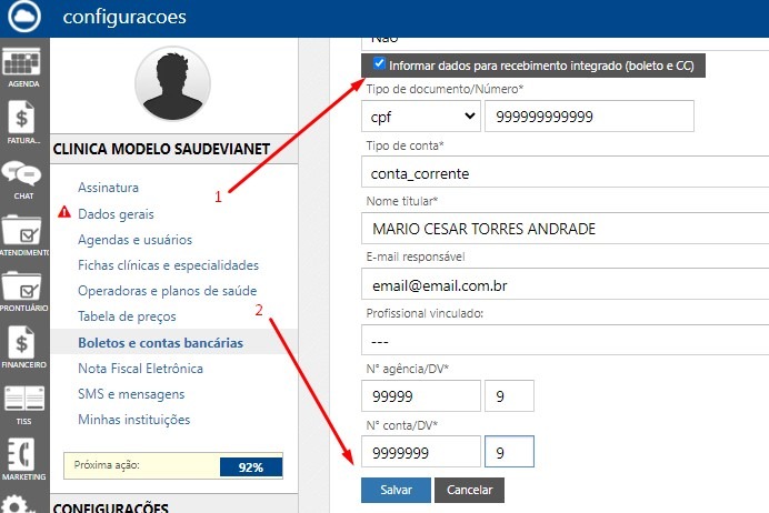 Em seguida, marque a opção “Informar dados para recebimento integrado”. Preencha todos os dados e depois clique em “Salvar”.